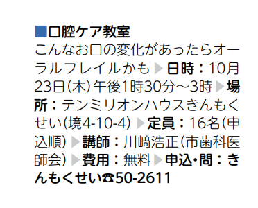 口腔ケア教室「こんなお口の変化があったらオーラルフレイルかも」(テンミリオンハウスきんもくせい)【10/23(木)】