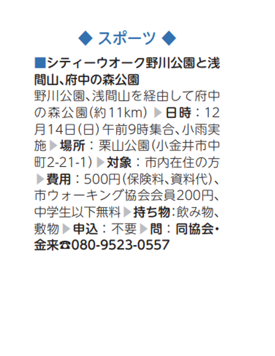 シティーウォーク「野川公園と浅間山、府中の森公園」(ウォーキング協会)【12/14(日)】