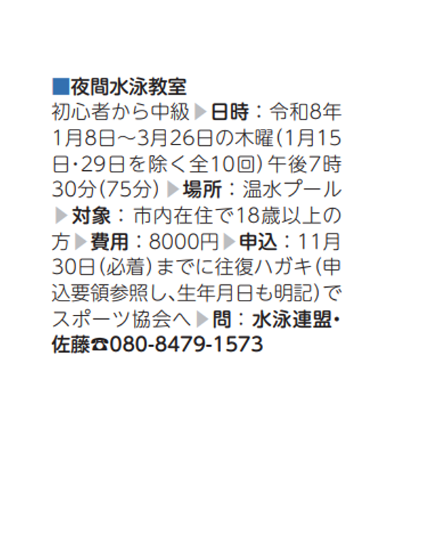夜間水泳教室(水泳連盟)【令和8年1/8(木)~3/26(木)】