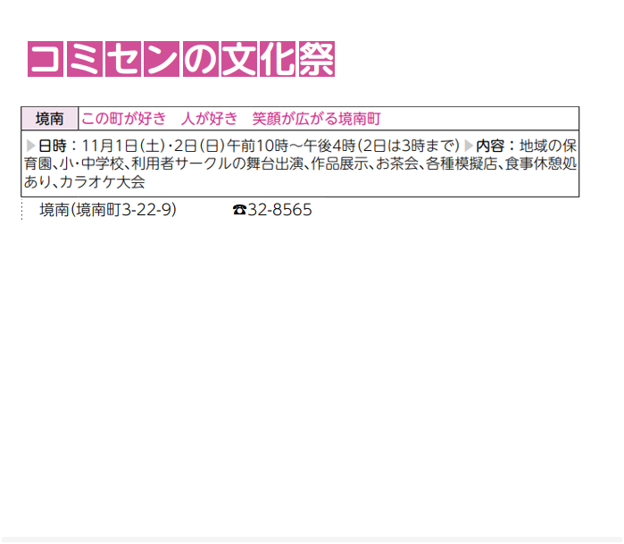 健康づくり支援センター健康づくり情報の展示(境南コミセン文化祭)【11/1(土)・2(日)】