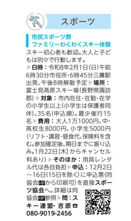 市民スポーツ祭「ファミリーわくわくスキー体験」【令和8年2/1(日)】