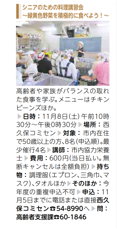シニアのための料理講習会(高齢者支援課)【10/8(水)・12日(日)】