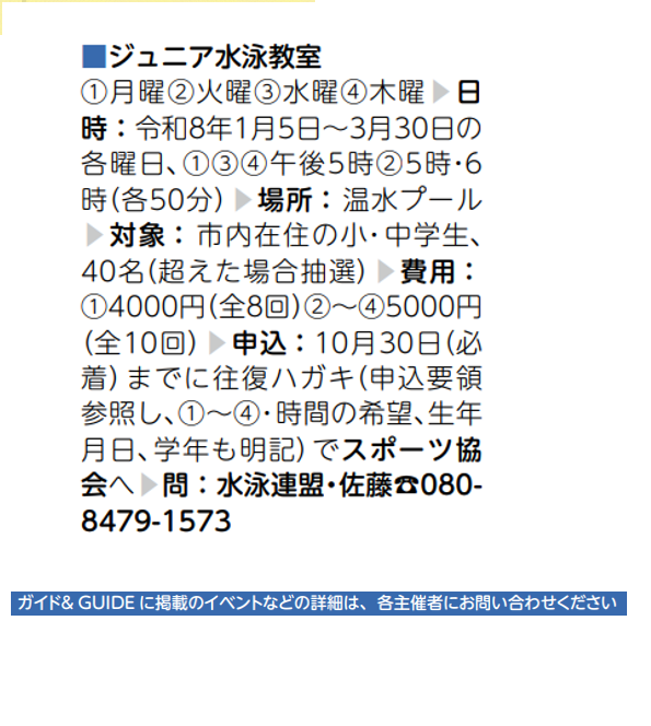 ジュニア水泳教室(水泳連盟)【令和8年1/5(月)~3/30(月)他】