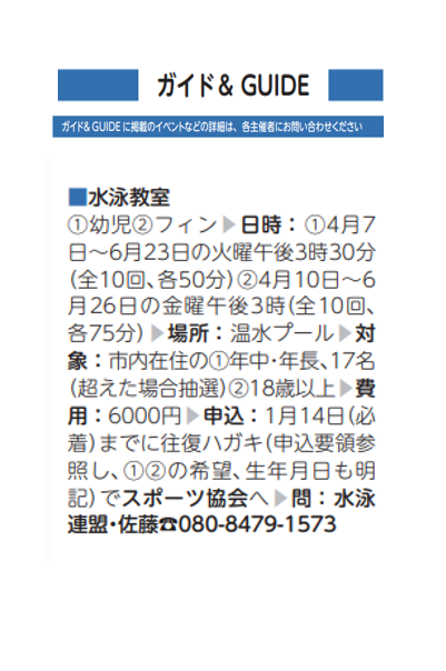 水泳教室(水泳連盟)【4/7(火)~6/23(火)他】