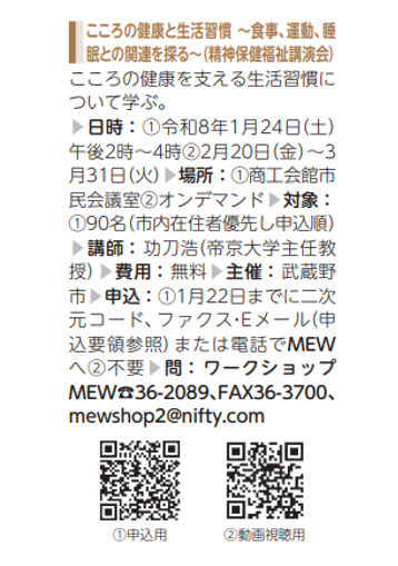 こころの健康と生活習慣~食事、運動、睡眠との関連を探る~(ワークショップMEW)【令和8年1/24(土)他】