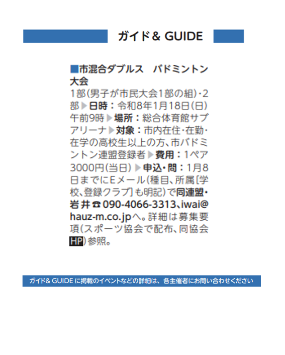 市混合ダブルス バドミントン(スポーツ協会)【令和8年1/18(日)】