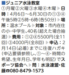 ジュニア水泳教室(水泳連盟)【4/6(月)~6/30(月)他】