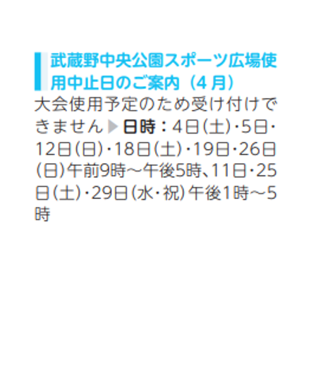 《使用中止のお知らせ》武蔵野中央公園スポーツ広場【4月分】